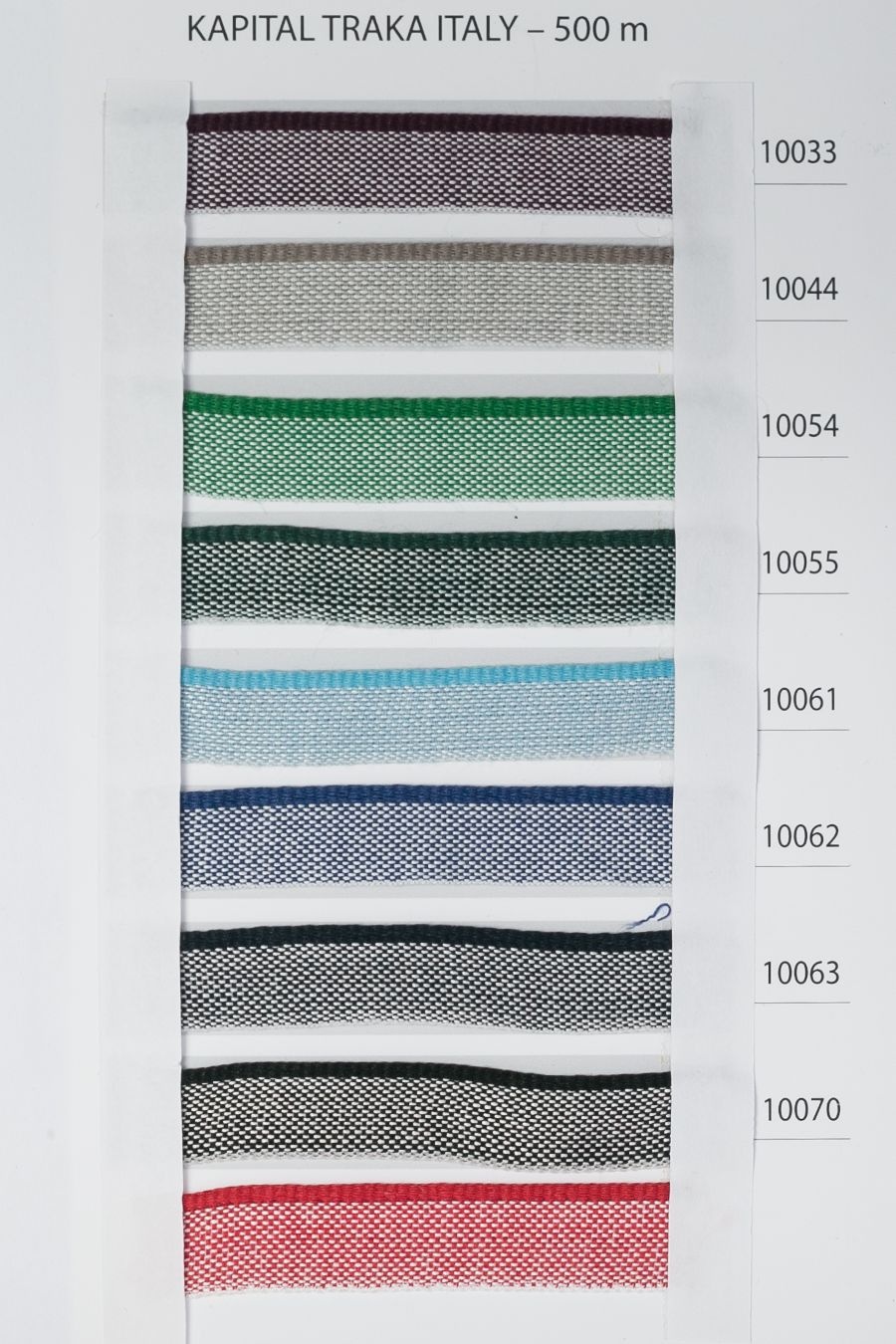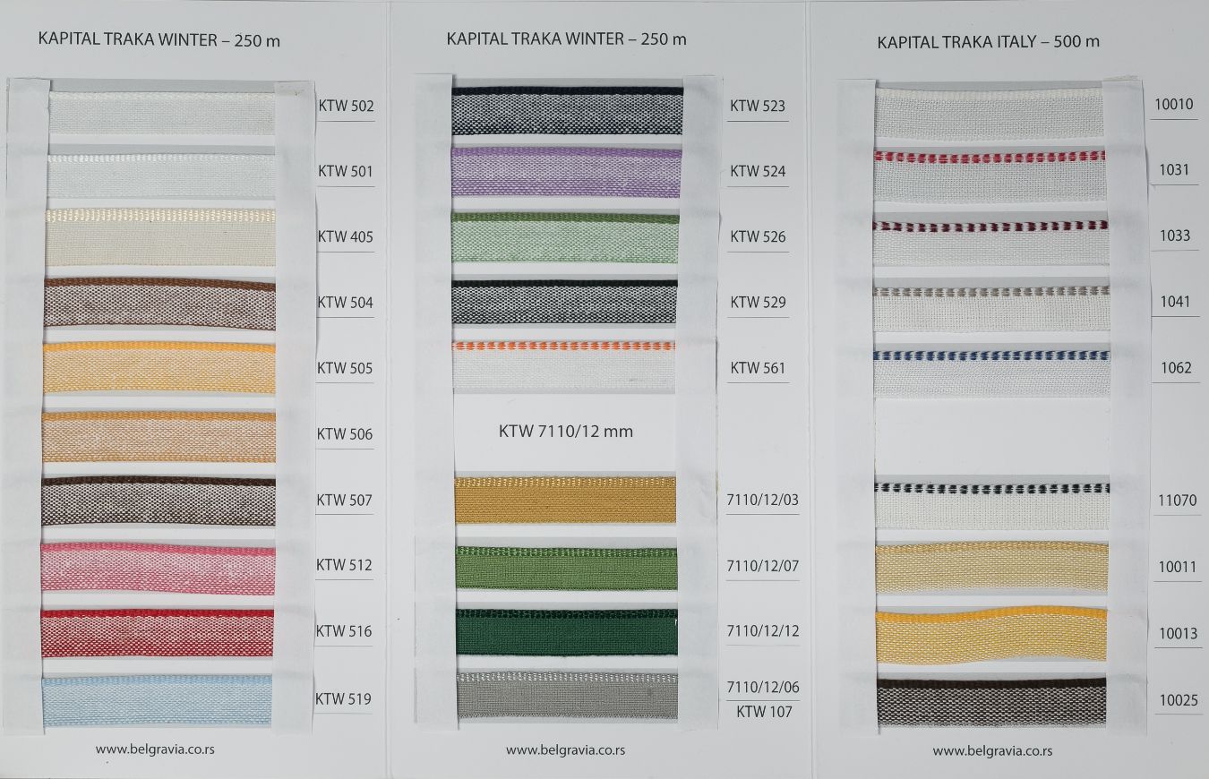 Kapital trake različitih boja i kvaliteta; u koturovima dužine 500m ili 250 m. Širina 12 mm.
