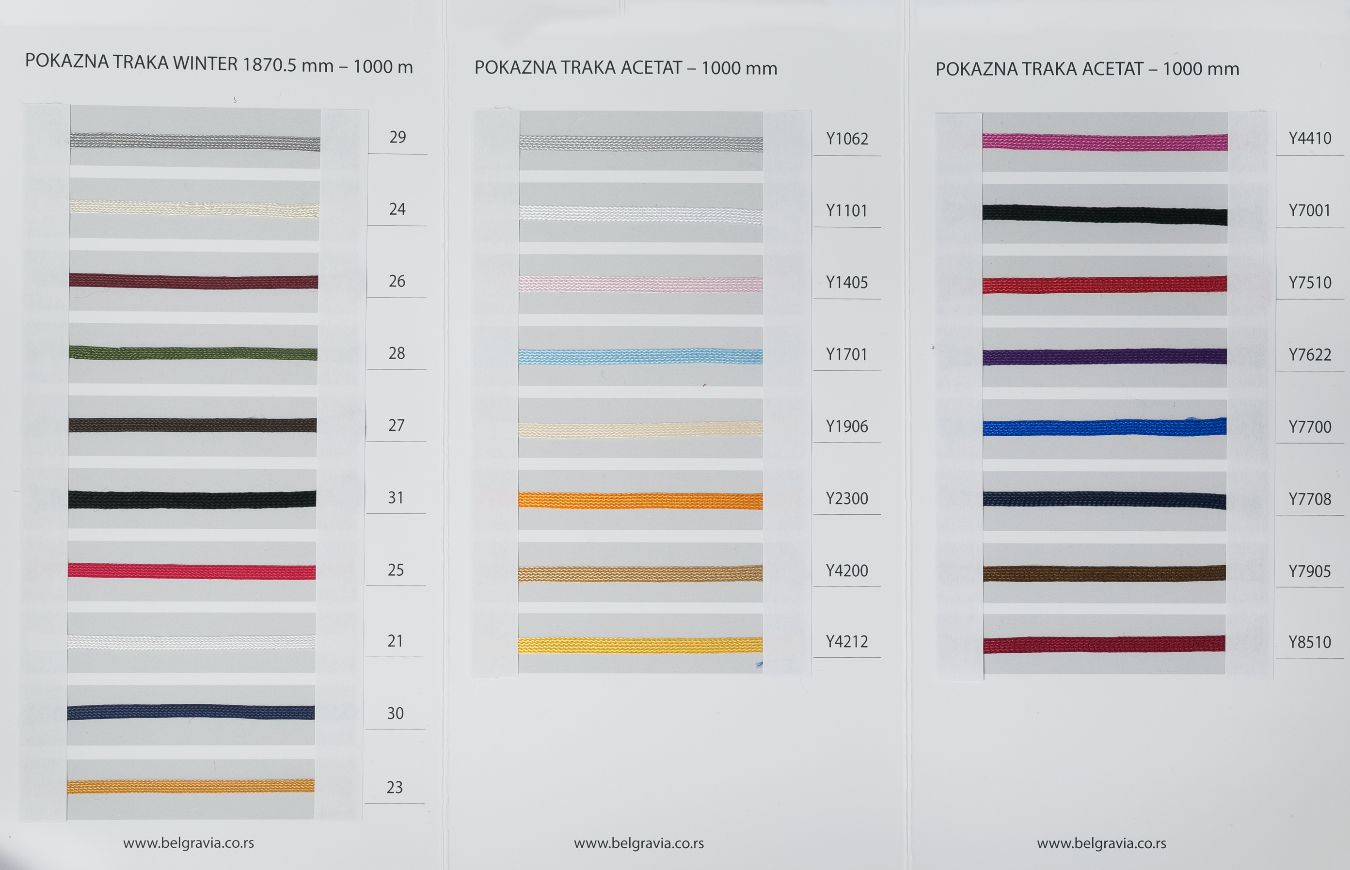 Acetatne pokazne trake širine 4-5mm, dostupne u velikom broju boja. Pakovanje: 1000m