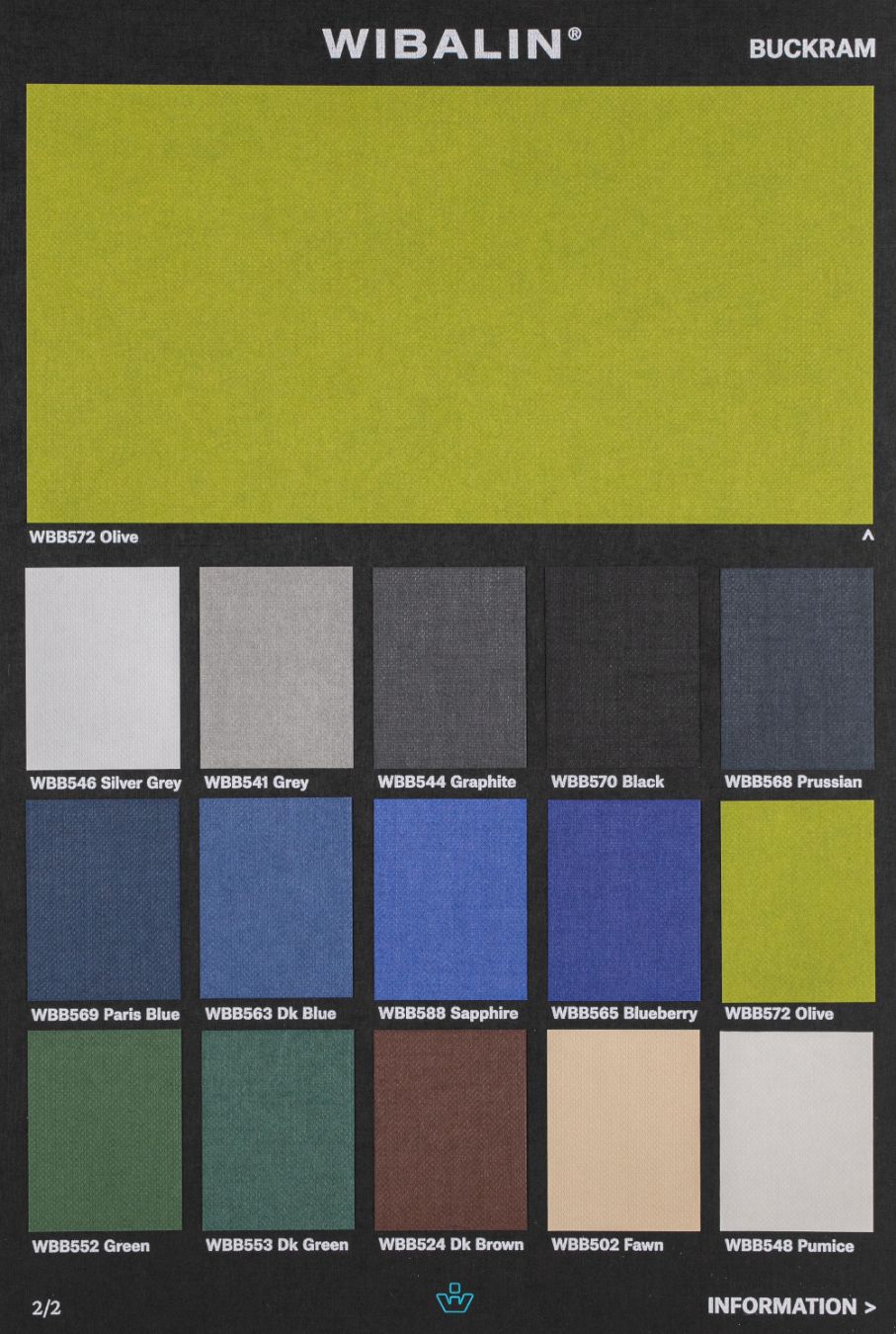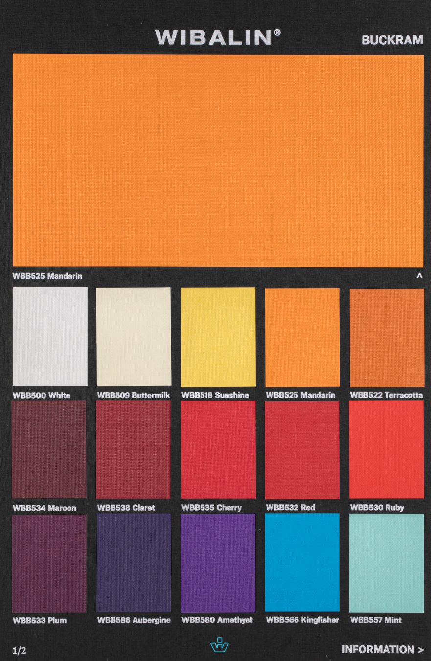 WIBALIN® Buckram je dostupan 30 boja, u gramaturama od 115 gr/m2 za papire u boji i 125 gr/m2 za papir u beloj boji. Standardno sa lagera u Beogradu u tabacima 76 x 102 cm ili, na zahtev, u rolni širine 102 cm, dužine 100 m.
