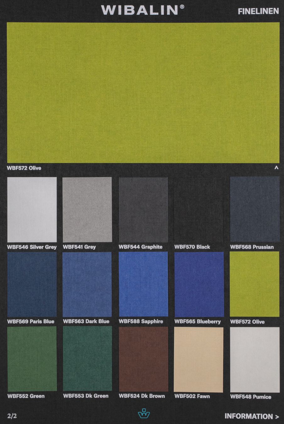 WIBALIN® Finelinen je dostupan u 30 boja, u gramaturama od 115 gr/m2 za papire u boji i 125 gr/m2 za papir u beloj boji. Standardno sa lagera u Beogradu u tabacima 76 x 102 cm.