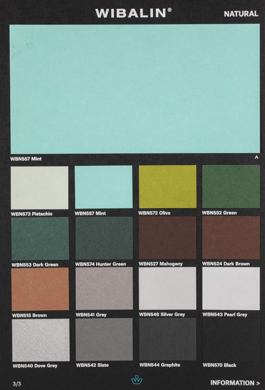 WIBALIN® je dostupan u 5 struktura i 50 boja, u gramaturama od 115 gr/m2 za papire u boji i 125 gr/m2 za papir u beloj boji. Standardno sa lagera u Beogradu u tabacima 76 x 102 cm ili, na zahtev, u rolni širine 102 cm, dužine 100 m.